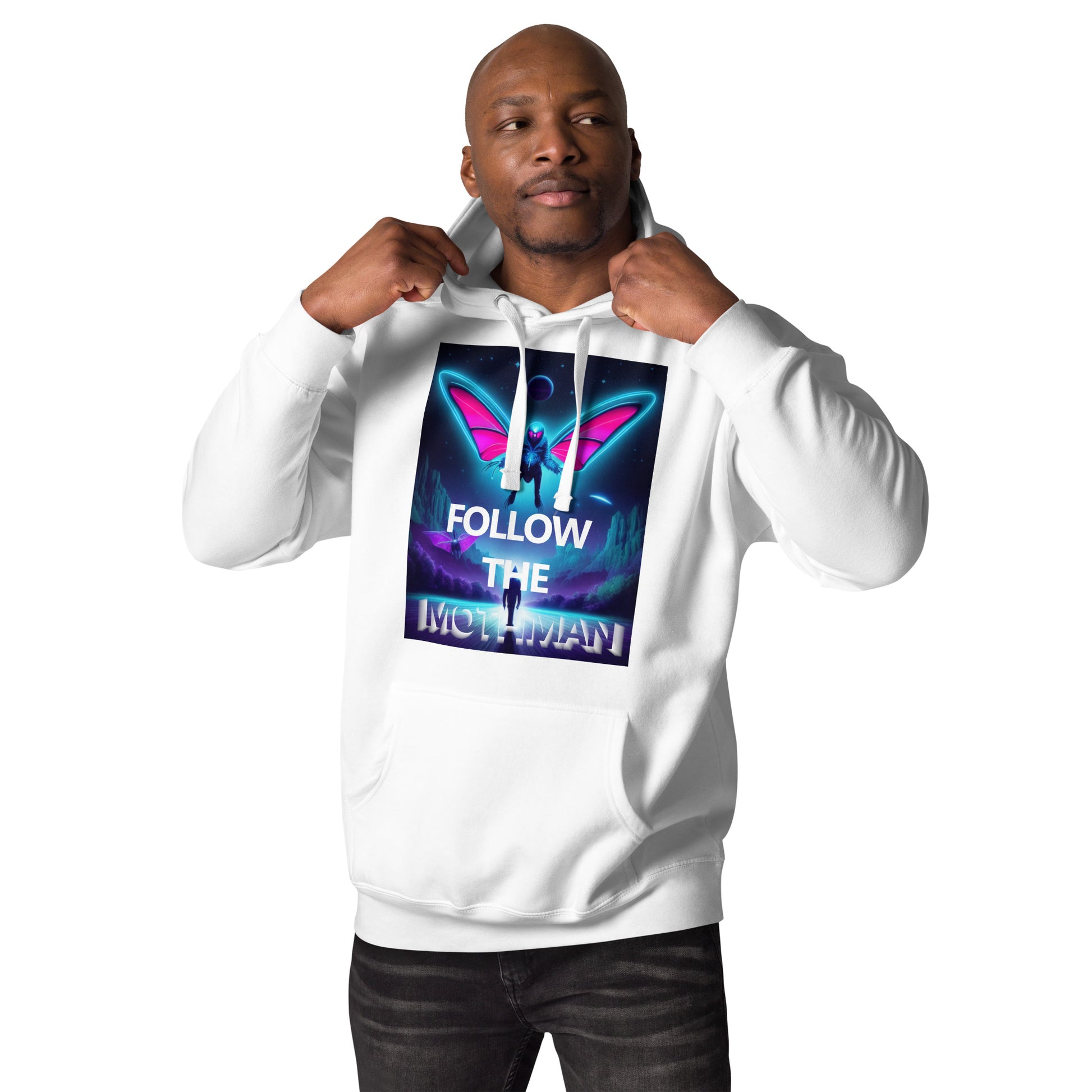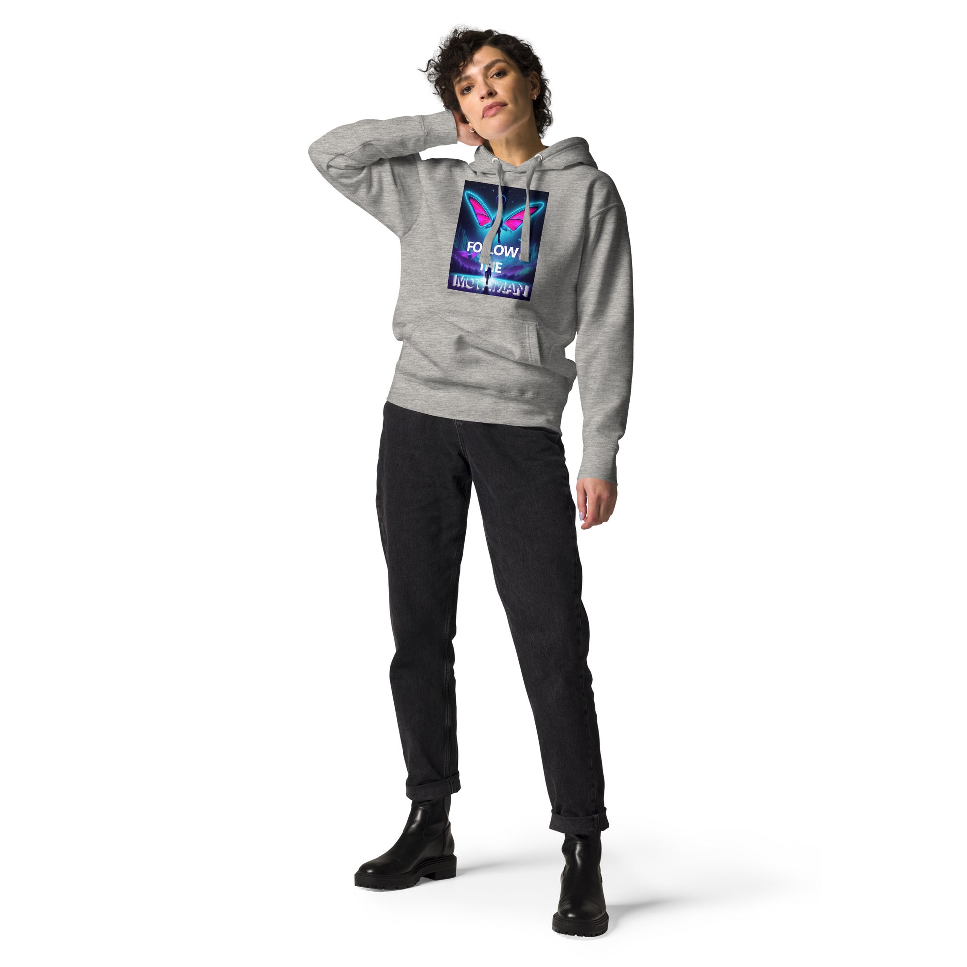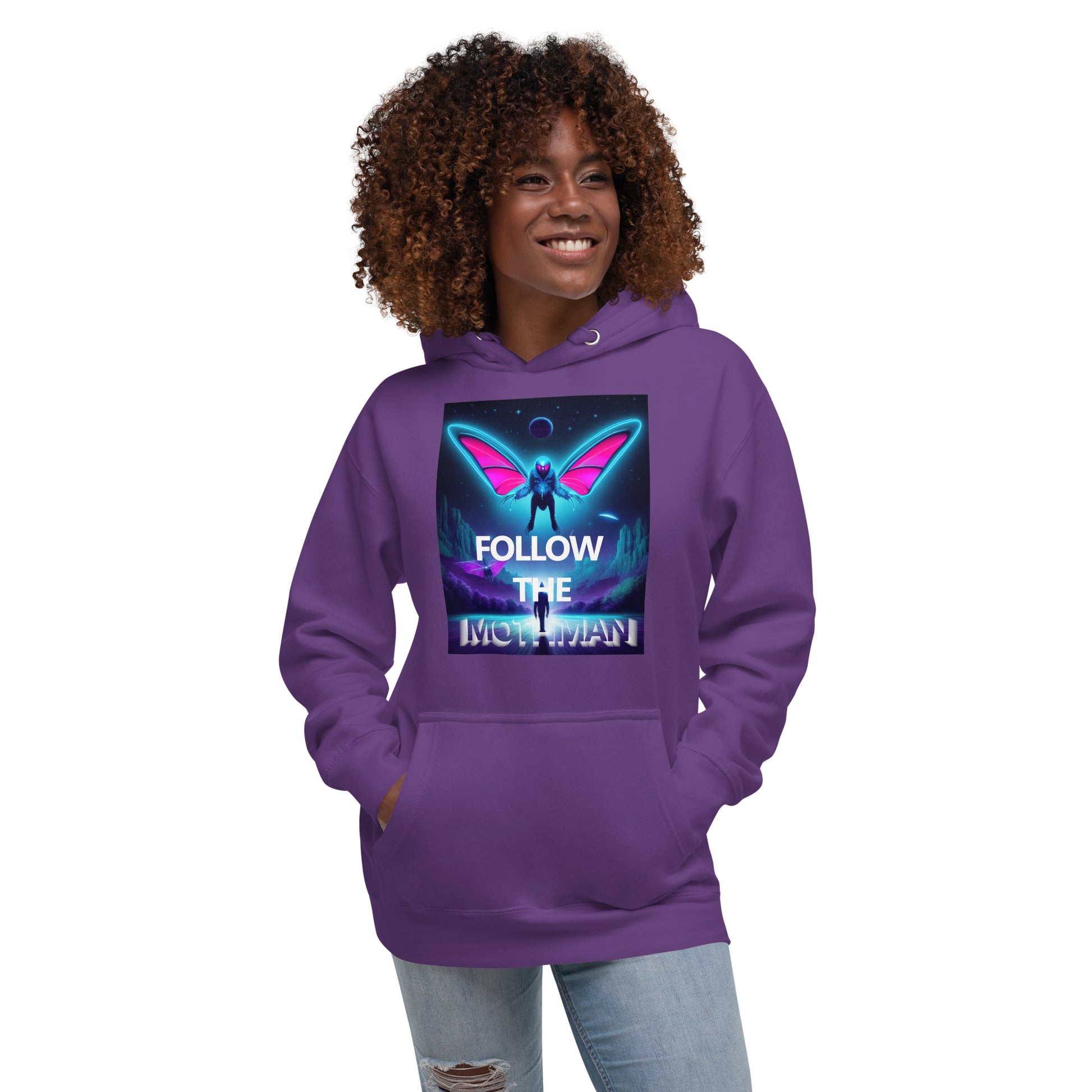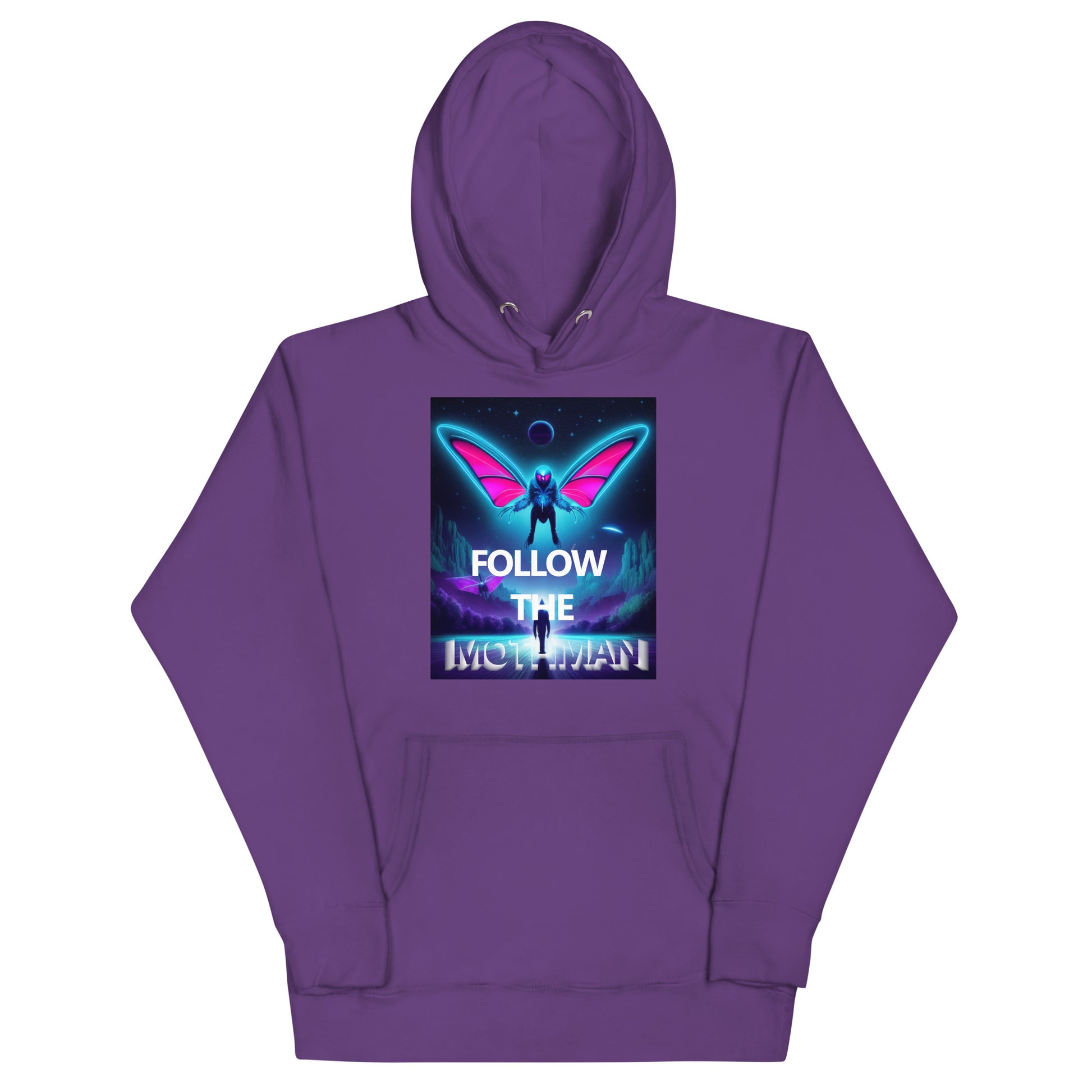 Follow The Mothman in the softest hoodie you'll ever own. You won't regret buying this classic streetwear piece of apparel with a convenient pouch pocket and warm hood for chilly evenings and cornfield wanderings.