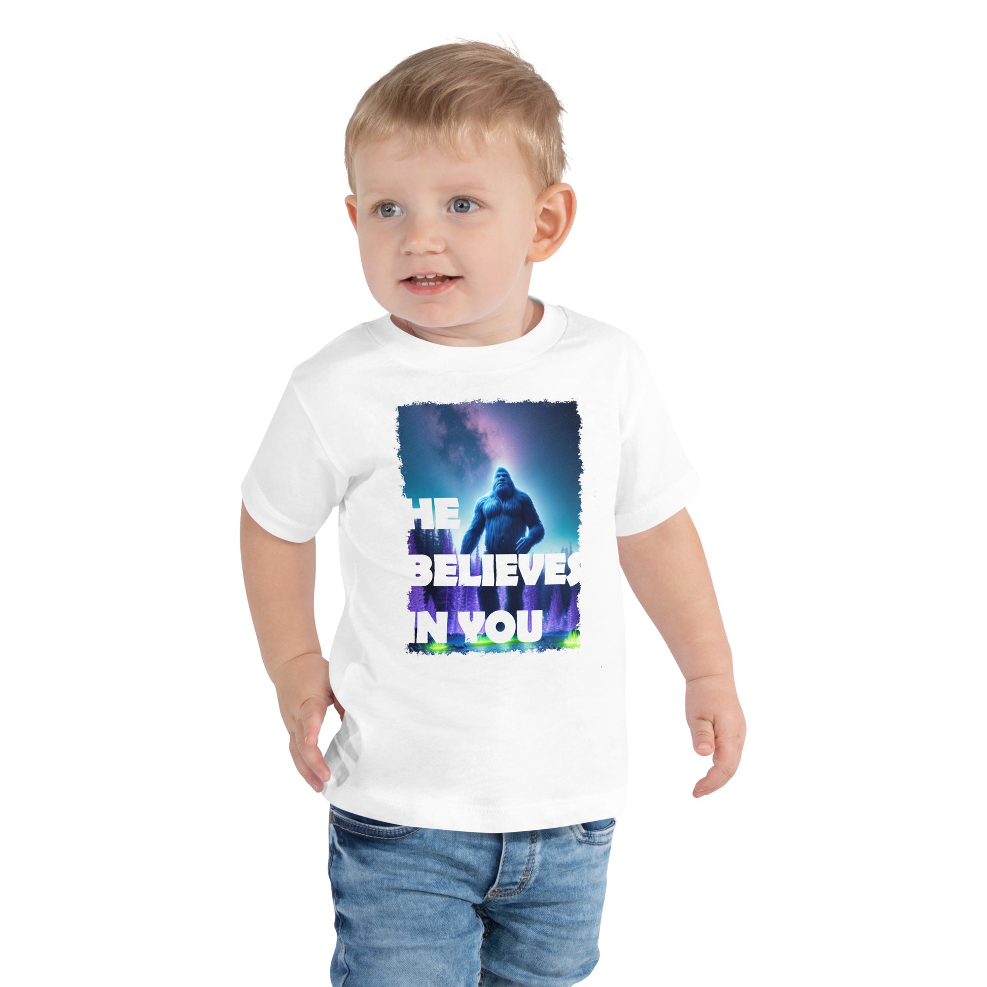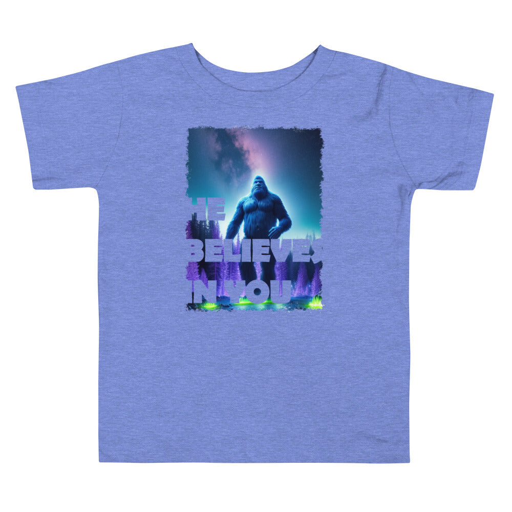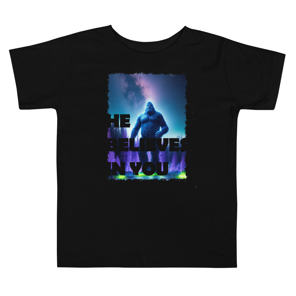 He Believes In You and you should believe in him too! Let your toddler do their thing while feeling super comfy and looking extra stylish in this short-sleeve jersey t-shirt from 100% cotton with a unique print for mobility during the most strenuous of Bigfoot hunts. The tee is soft, durable, and bound to become the staple of your toddler's wardrobe.