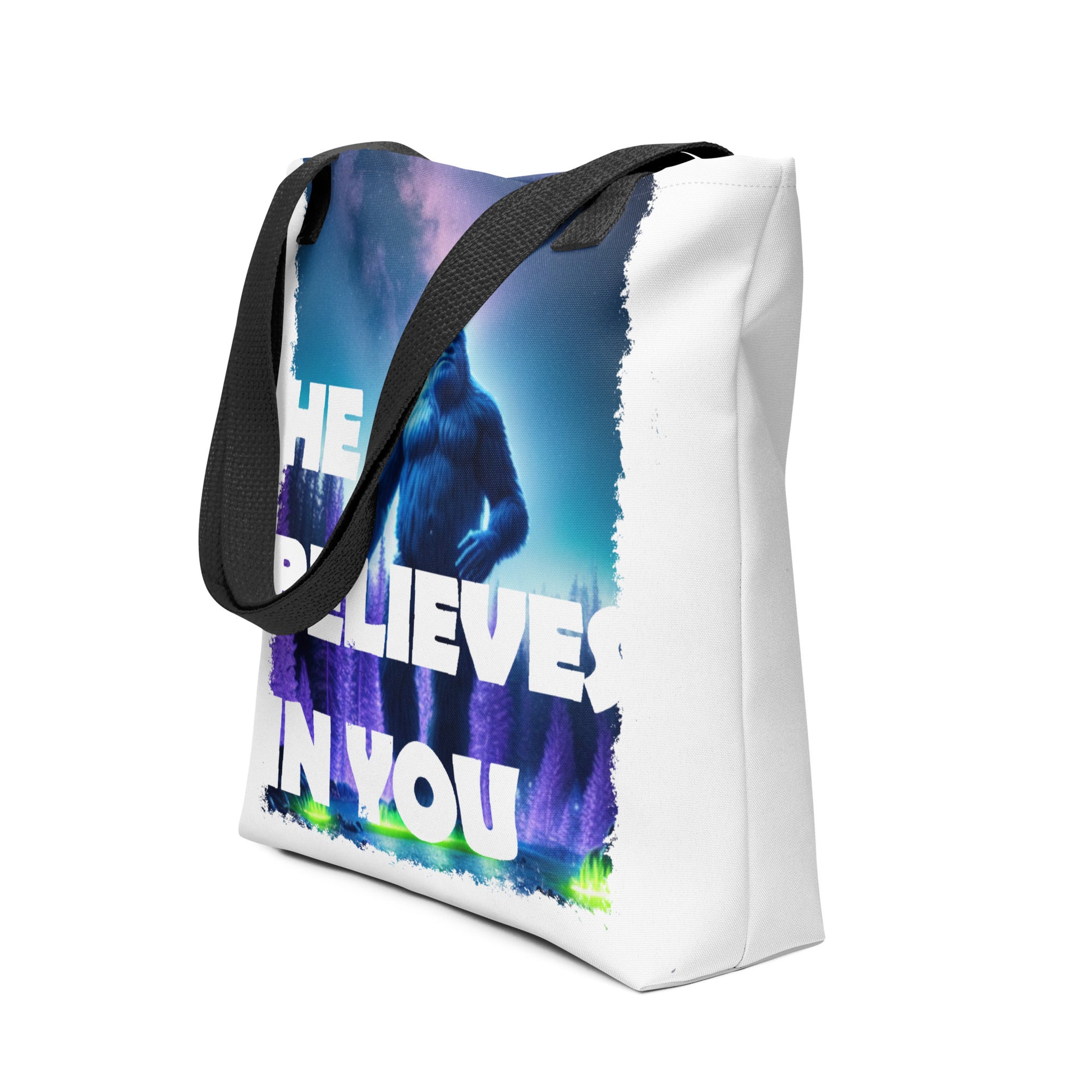 Gather all your necessary Bigfoot gear, and keep it all in one place in a spacious and trendy tote bag to help you carry around everything a cryptid hunter needs. Doubles as a head cover when running terrified from the wilderness.