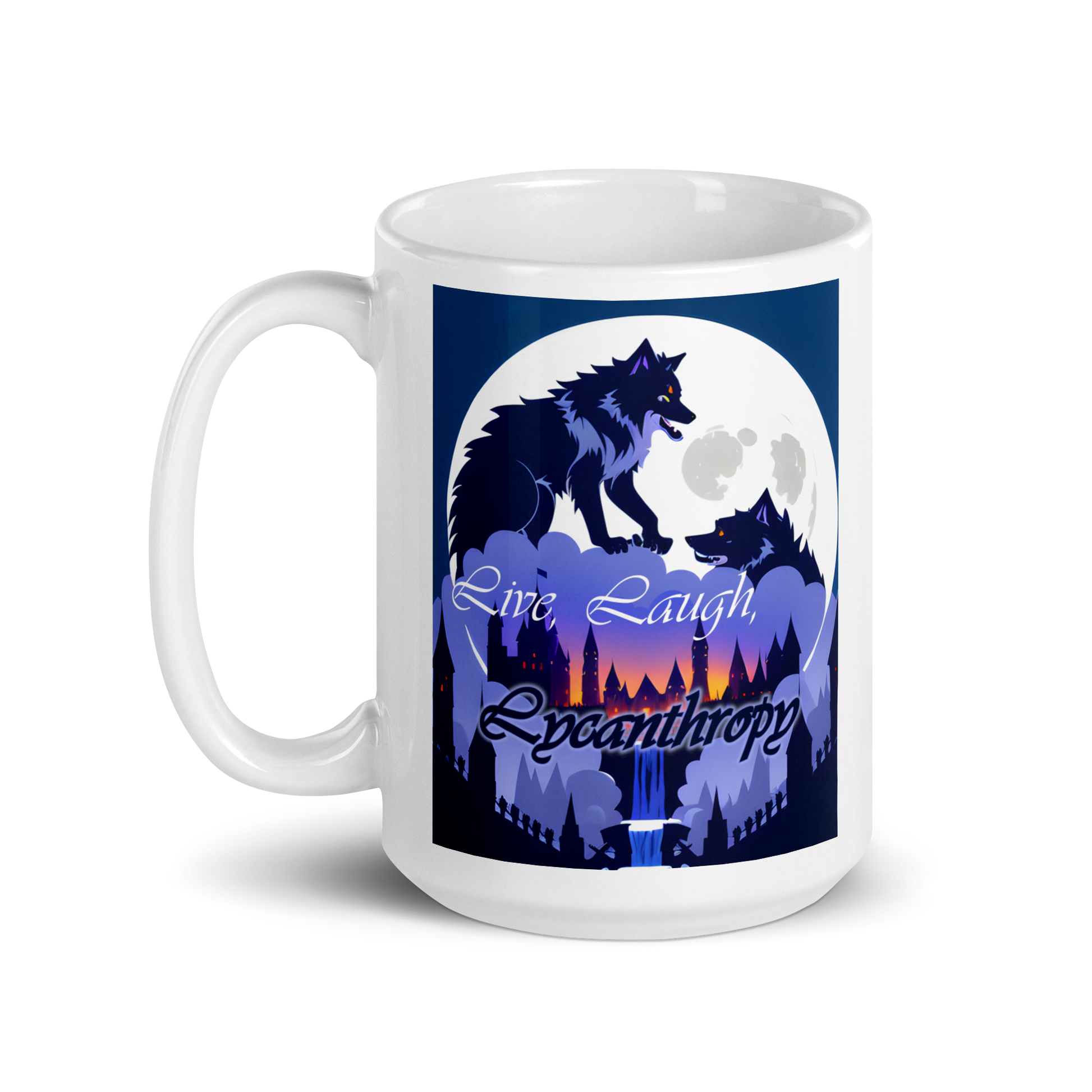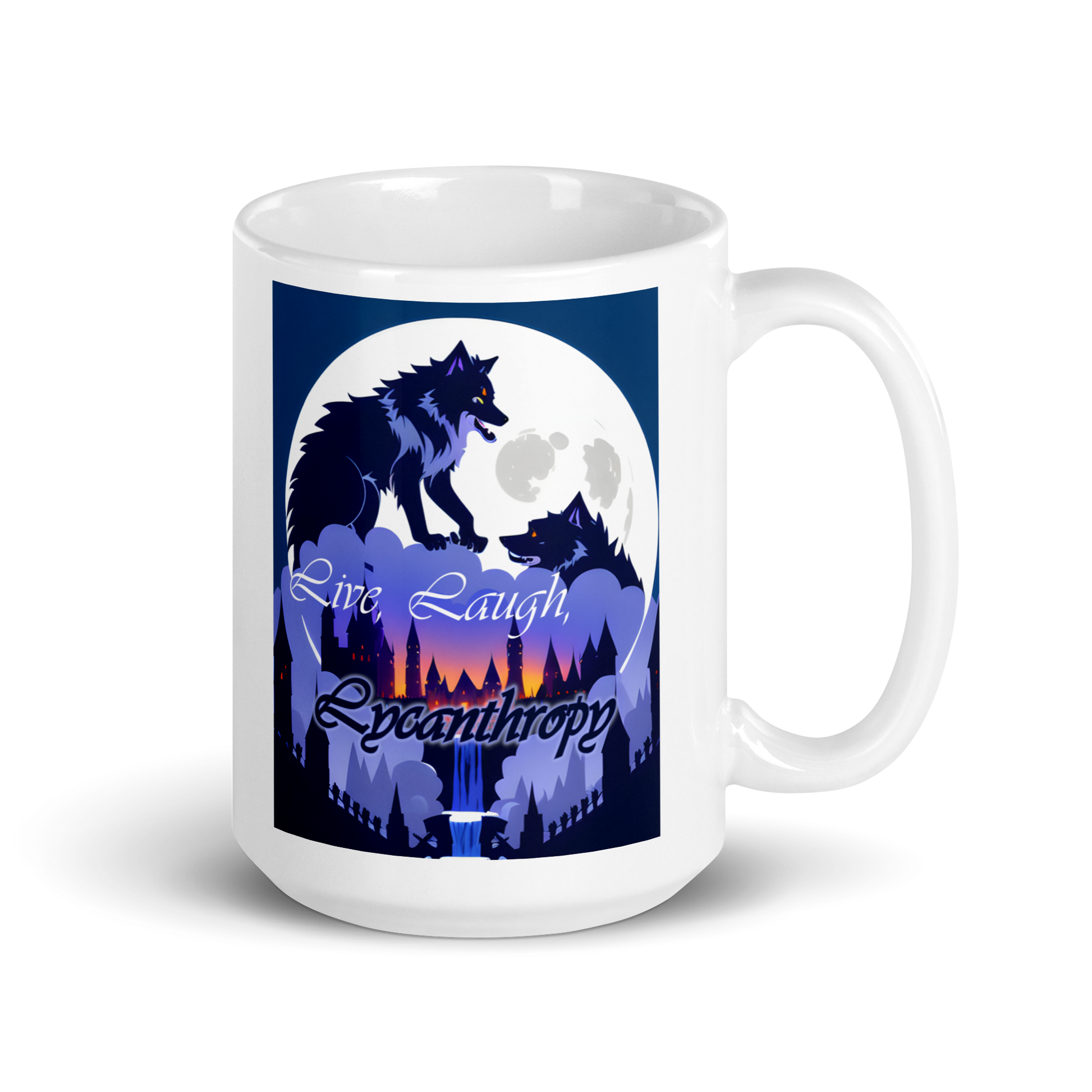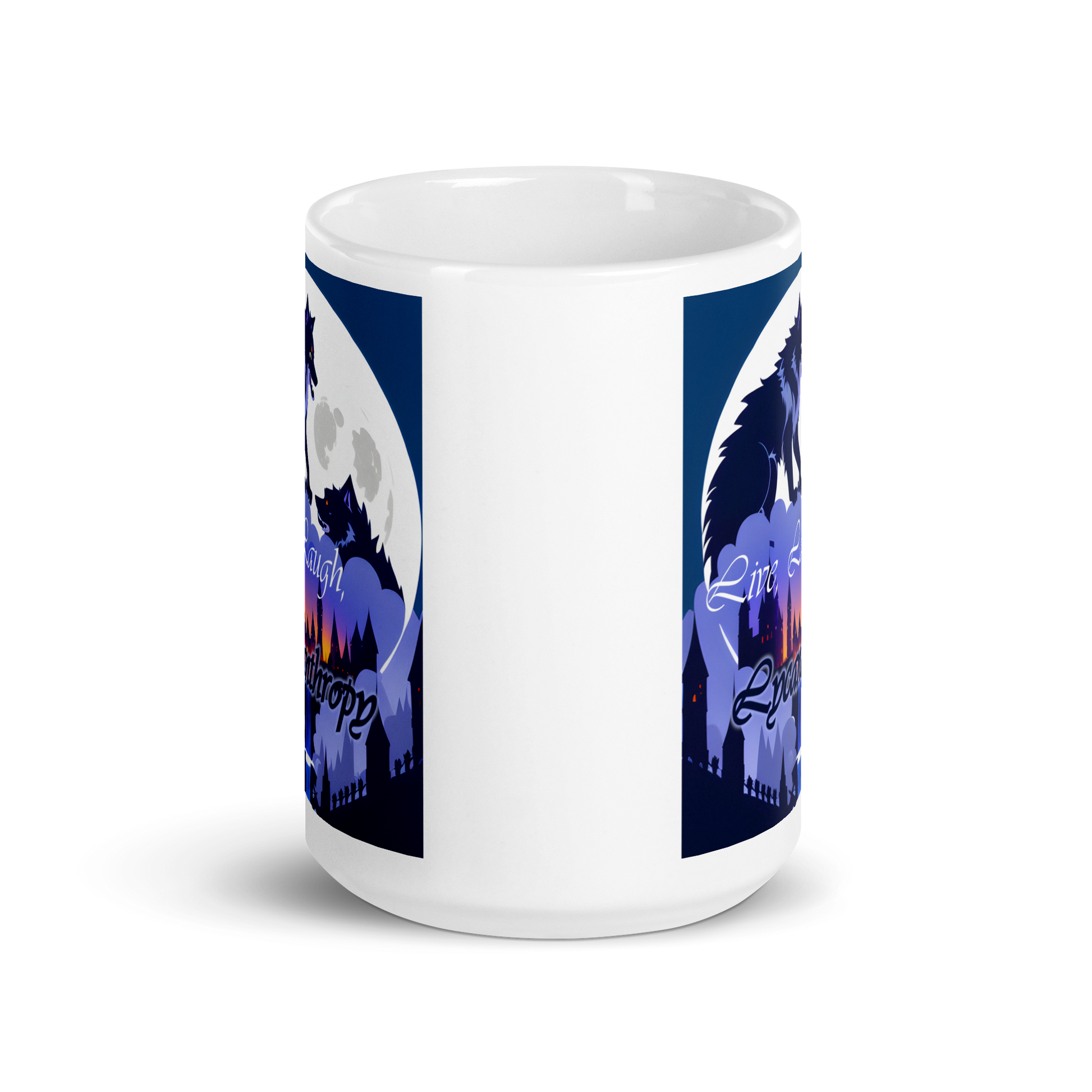 Whether you're drinking your morning coffee, evening tea, or something in between—you'll live, laugh, love this mug! It's sturdy and glossy with a vivid print that'll withstand the microwave and dishwasher. Let your best Lycan loose and sip in style.
