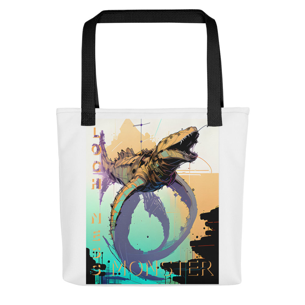A spacious and trendy tote bag to help you carry around everything that matters, featuring an inkpunk Loch Ness Monster on the hunt.