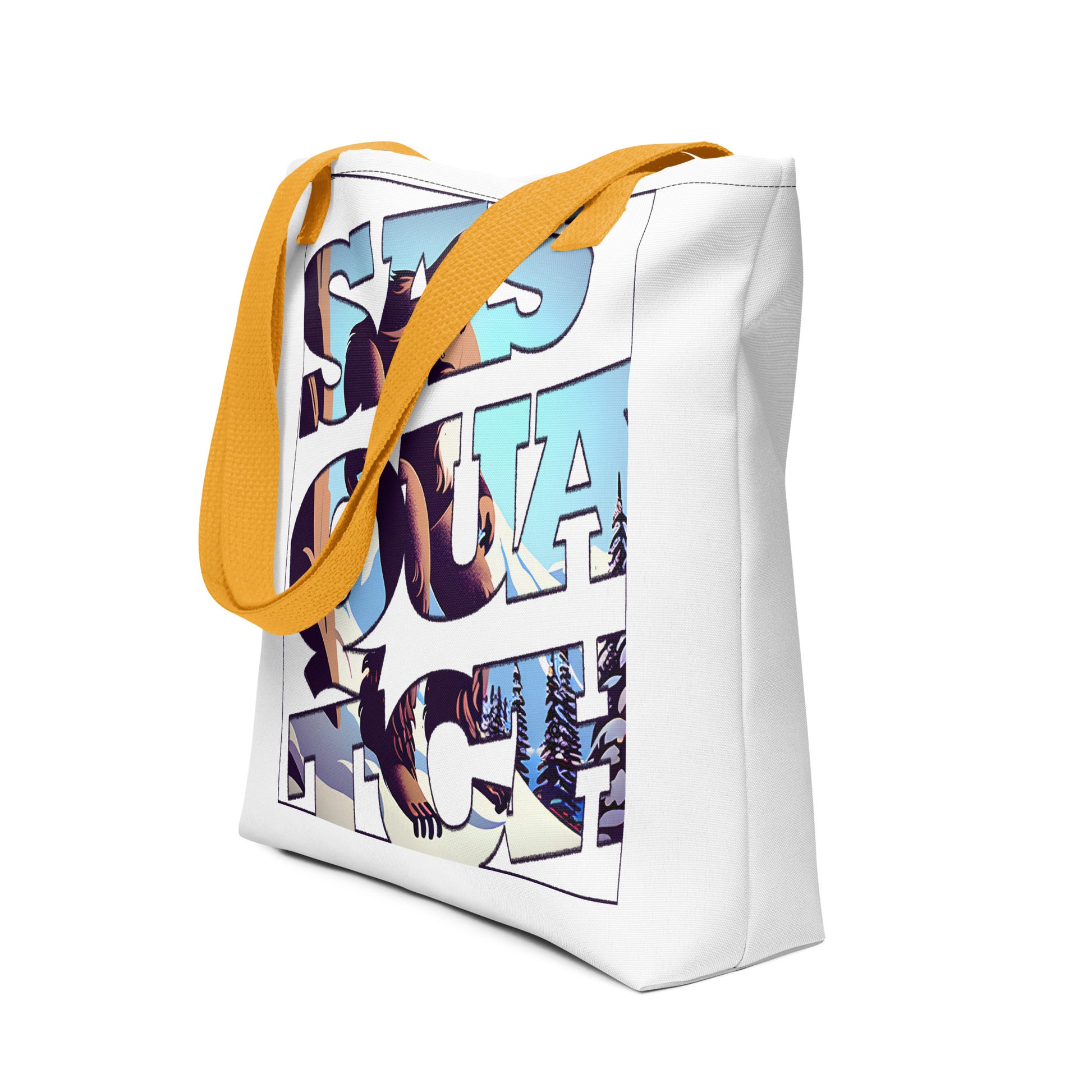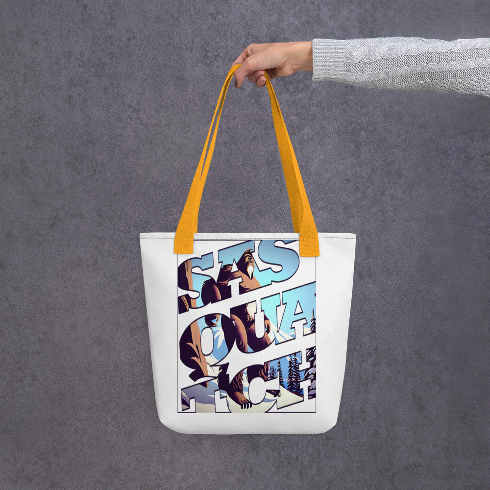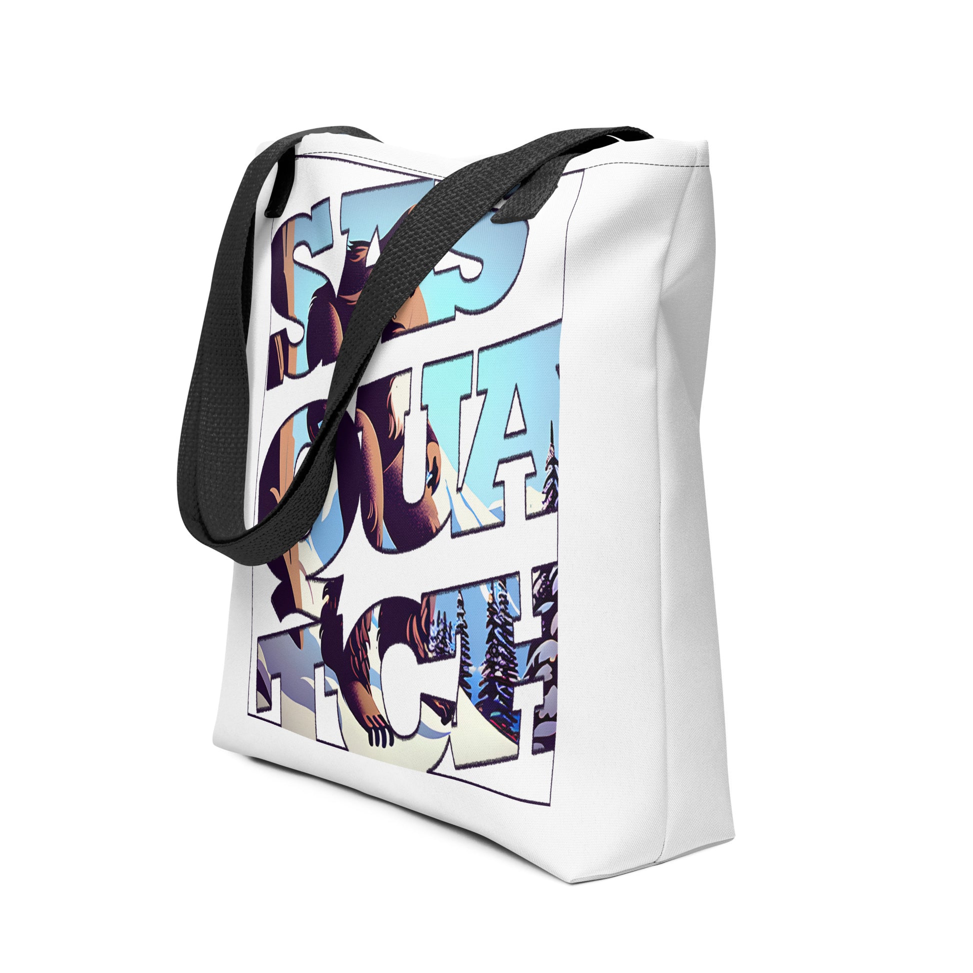 Travel the mountains seeking the Sasquatch with a spacious and trendy tote bag to help you carry around everything that matters.